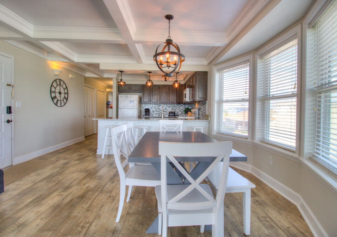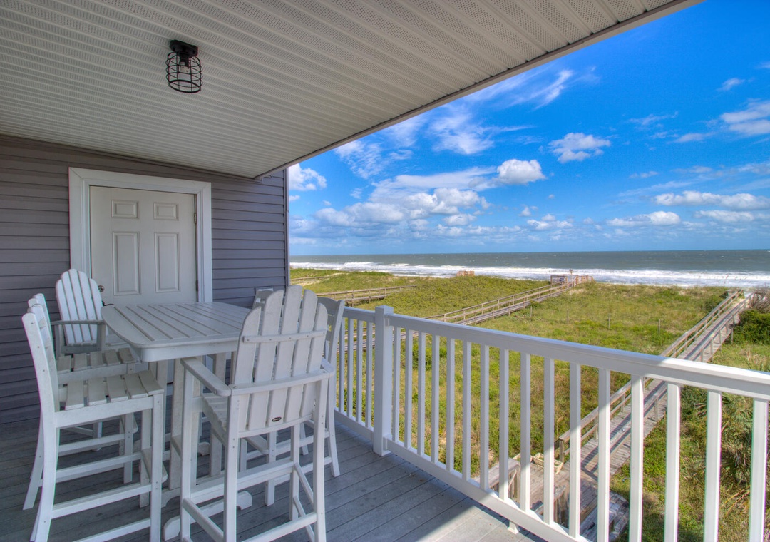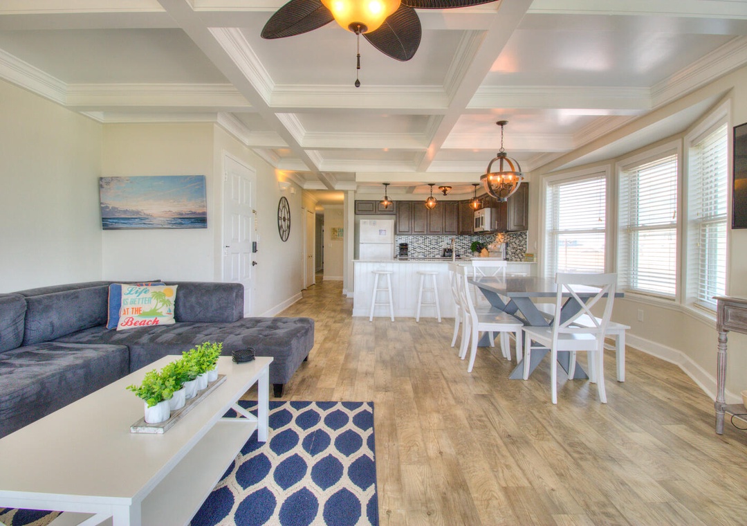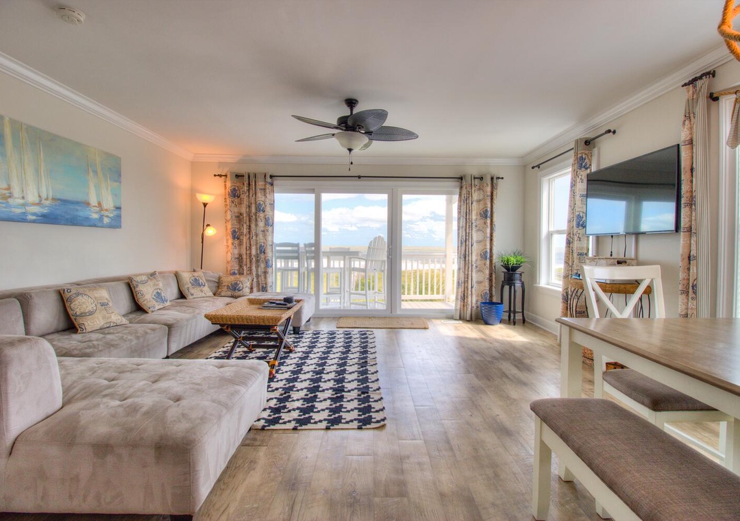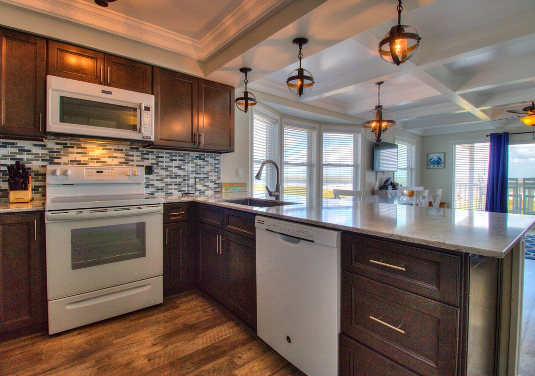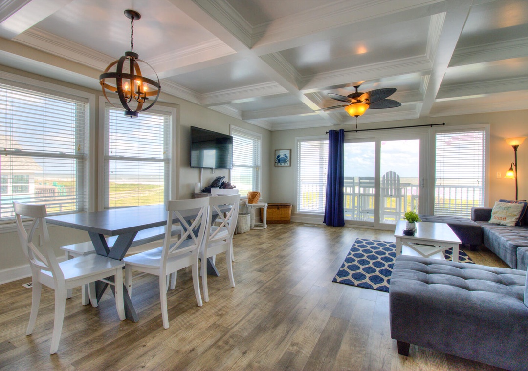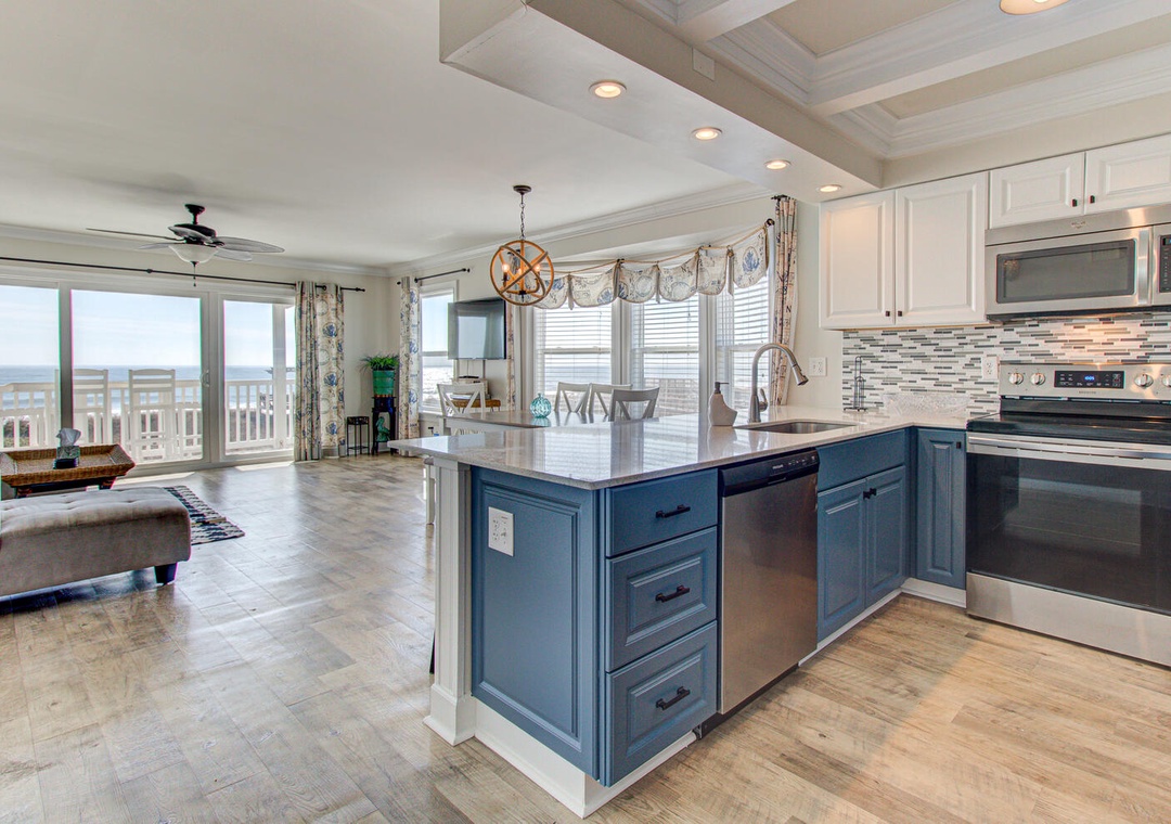 Each kitchen is fully stocked and designed for preparing and serving meals for the entire group. With seating for six at the dining tables and four additional barstools at the kitchen counters, there’s plenty of room for everyone to enjoy meals together. Both kitchens feature modern appliances, including flat-top stoves, microwaves, blenders, and 12-cup drip coffee makers, making it easy to prepare everything from quick breakfasts to full family dinners. Oceanfront views and deck access make these spaces perfect for relaxing and dining indoors or out.