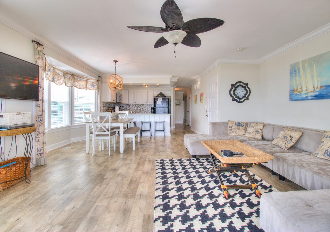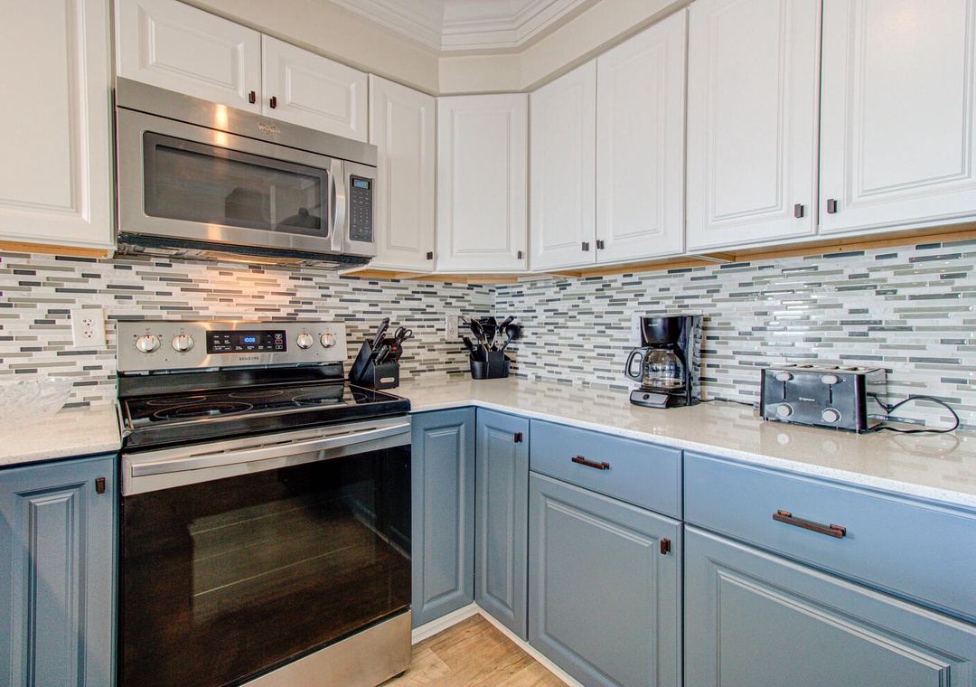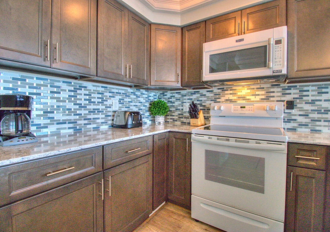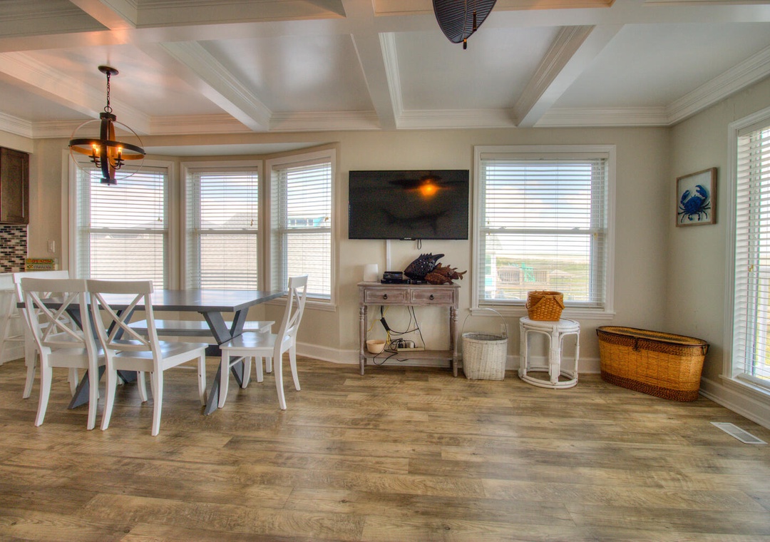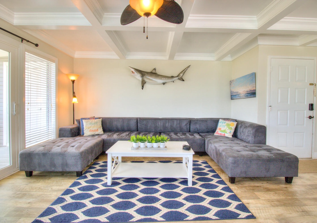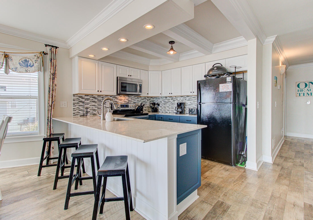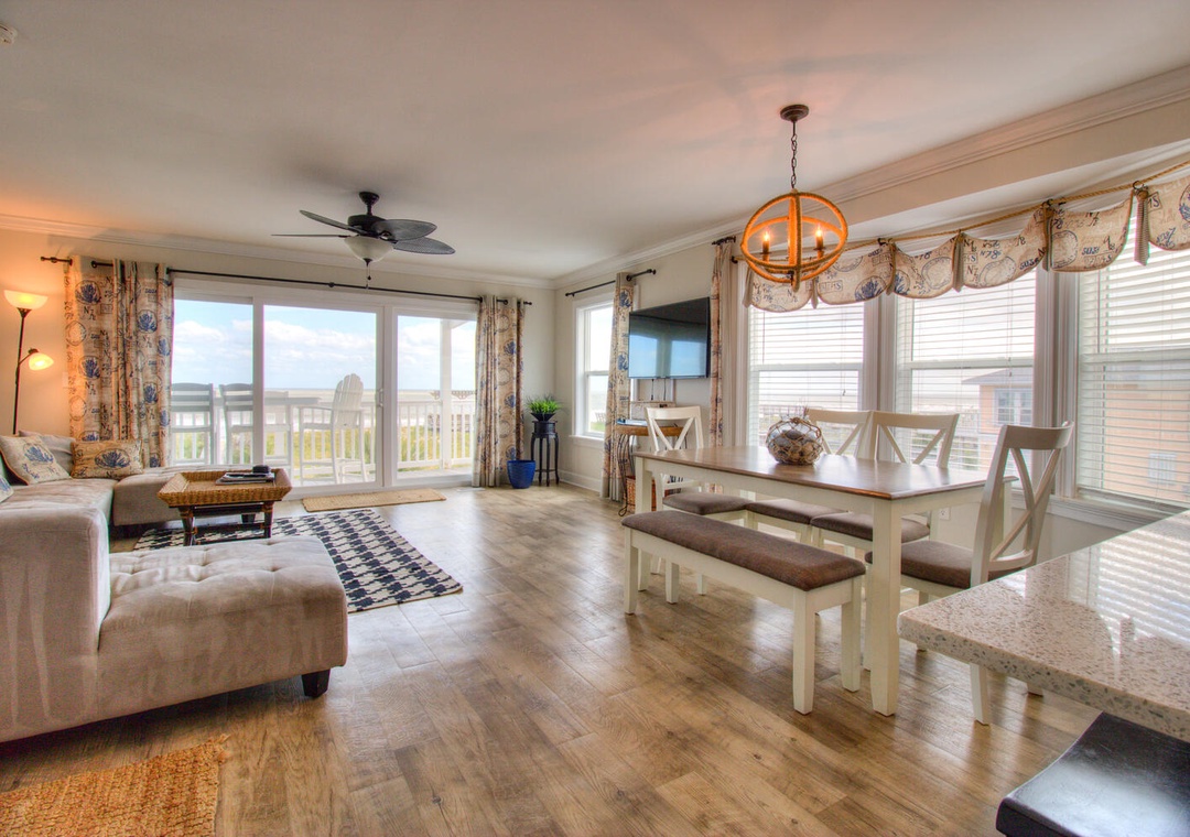 Each kitchen is fully stocked and designed for preparing and serving meals for the entire group. With seating for six at the dining tables and four additional barstools at the kitchen counters, there’s plenty of room for everyone to enjoy meals together. Both kitchens feature modern appliances, including flat-top stoves, microwaves, blenders, and 12-cup drip coffee makers, making it easy to prepare everything from quick breakfasts to full family dinners. Oceanfront views and deck access make these spaces perfect for relaxing and dining indoors or out.