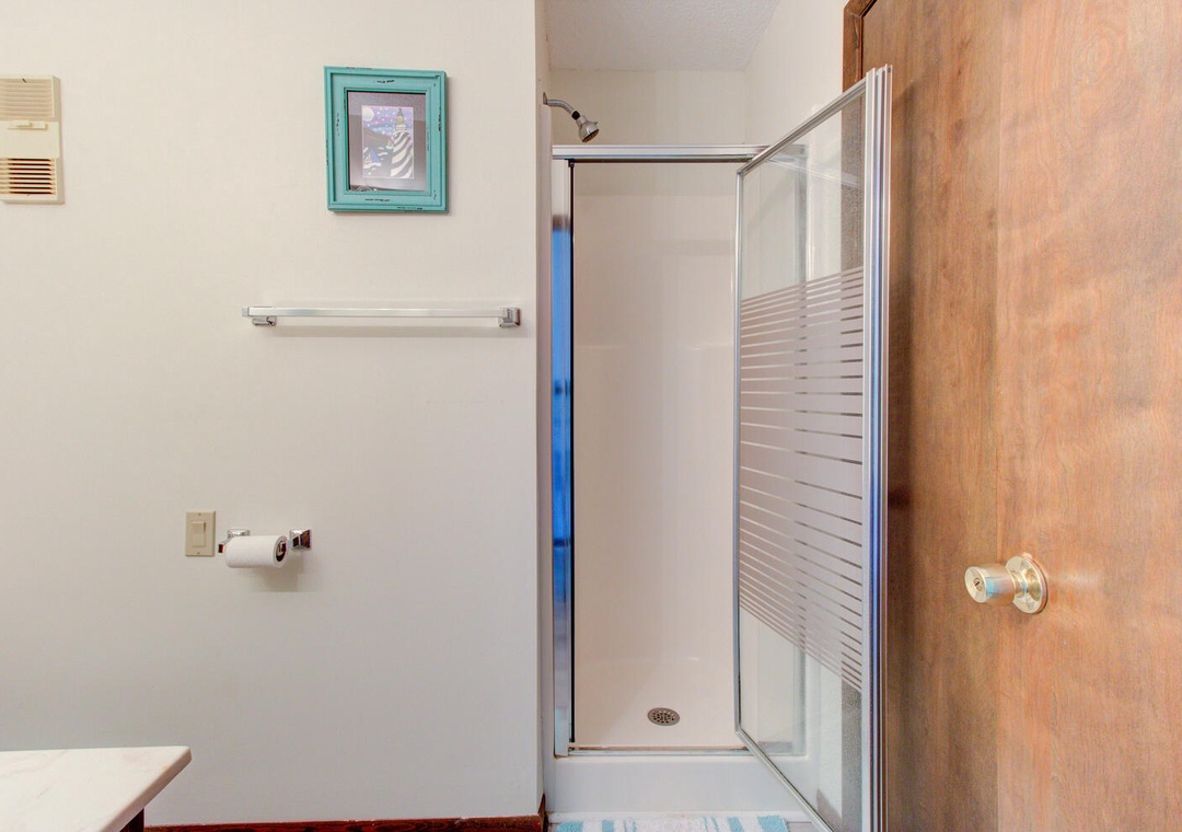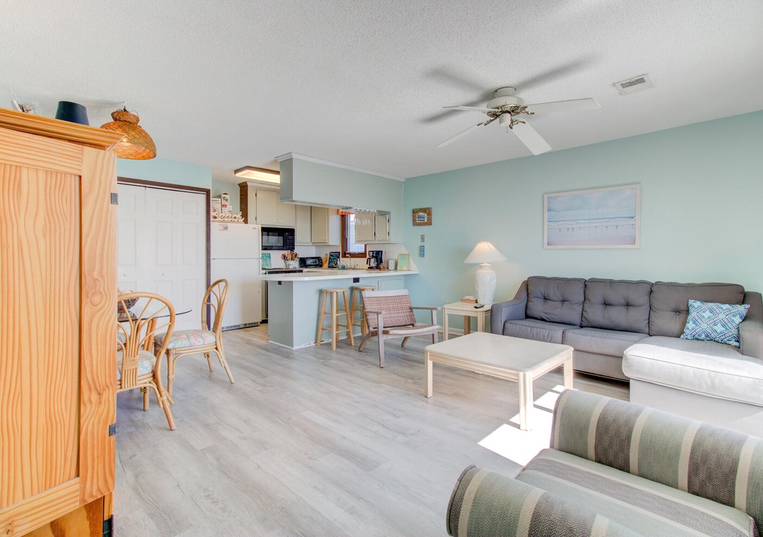 Inside, the open-concept living area is thoughtfully designed for relaxation and entertainment. The fully equipped kitchen features modern appliances, including a refrigerator with an icemaker, dishwasher, microwave, and drip coffeemaker, with barstool seating for two and a dining area for four. The cozy living room boasts a flat-screen TV with cable, a Blu-ray DVD player, books, and board games, all complemented by a ceiling fan and access to the oceanfront deck. Step outside to enjoy morning coffee or evening breezes at the deck’s table for two while taking in the stunning coastal scenery.