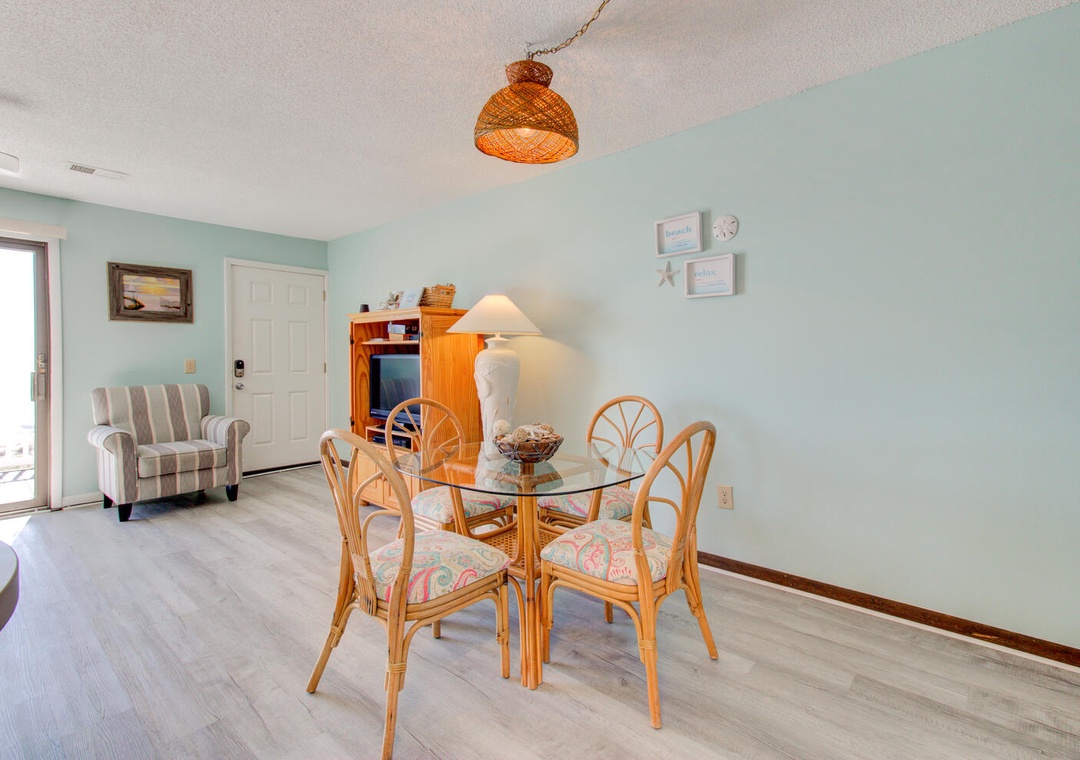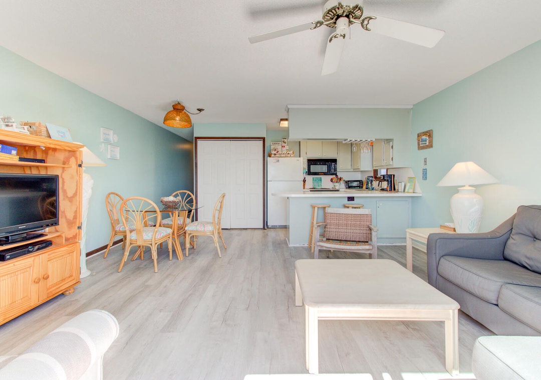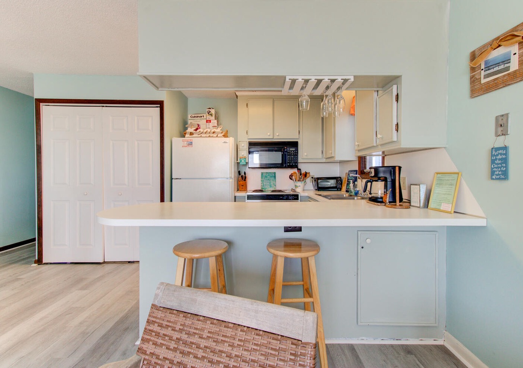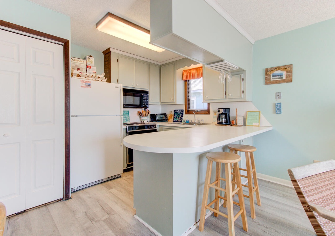 The condo’s two well-appointed bedrooms offer restful retreats. The master bedroom features a queen bed, a private deck with a street view, a box TV with cable, a ceiling fan, and an en-suite bathroom with a double vanity and glass door walk-in shower. The second bedroom has two twin beds, a flat-screen TV with a DVD player, a ceiling fan, and access to the second bathroom, which also has a glass door walk-in shower. A convenient laundry area with a top-loading washer and front-loading dryer adds to the ease of your stay. With its inviting atmosphere and prime location, William and Mary 32A-Hitch Hideaway promises a memorable beachside escape.
