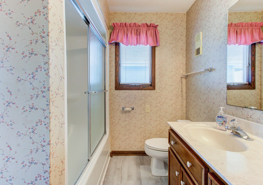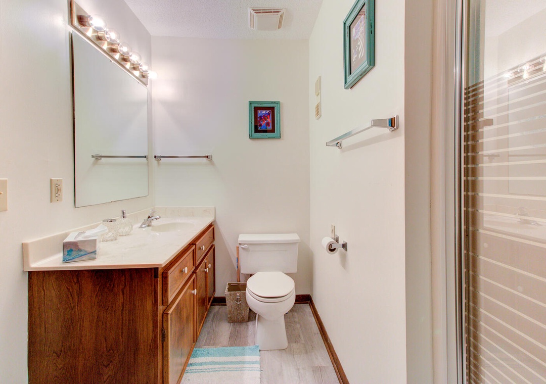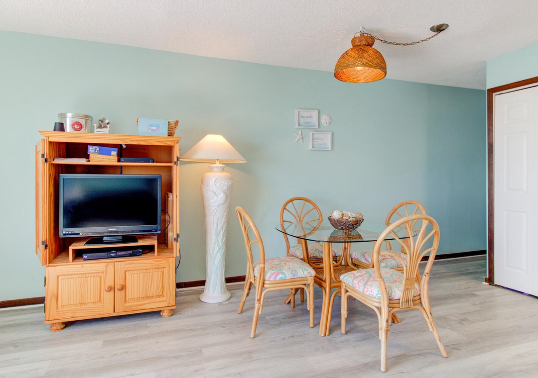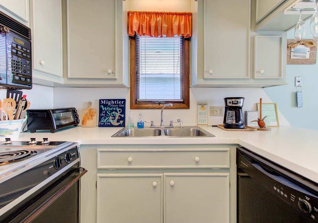 The condo’s two well-appointed bedrooms offer restful retreats. The master bedroom features a queen bed, a private deck with a street view, a box TV with cable, a ceiling fan, and an en-suite bathroom with a double vanity and glass door walk-in shower. The second bedroom has two twin beds, a flat-screen TV with a DVD player, a ceiling fan, and access to the second bathroom, which also has a glass door walk-in shower. A convenient laundry area with a top-loading washer and front-loading dryer adds to the ease of your stay. With its inviting atmosphere and prime location, William and Mary 32A-Hitch Hideaway promises a memorable beachside escape.