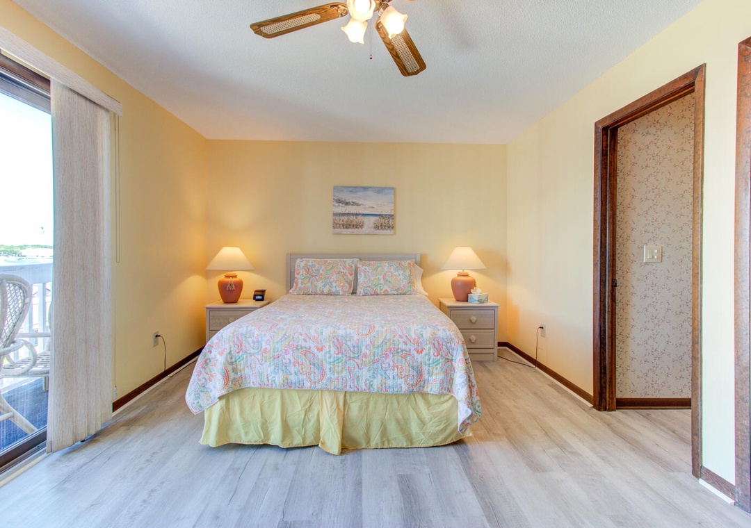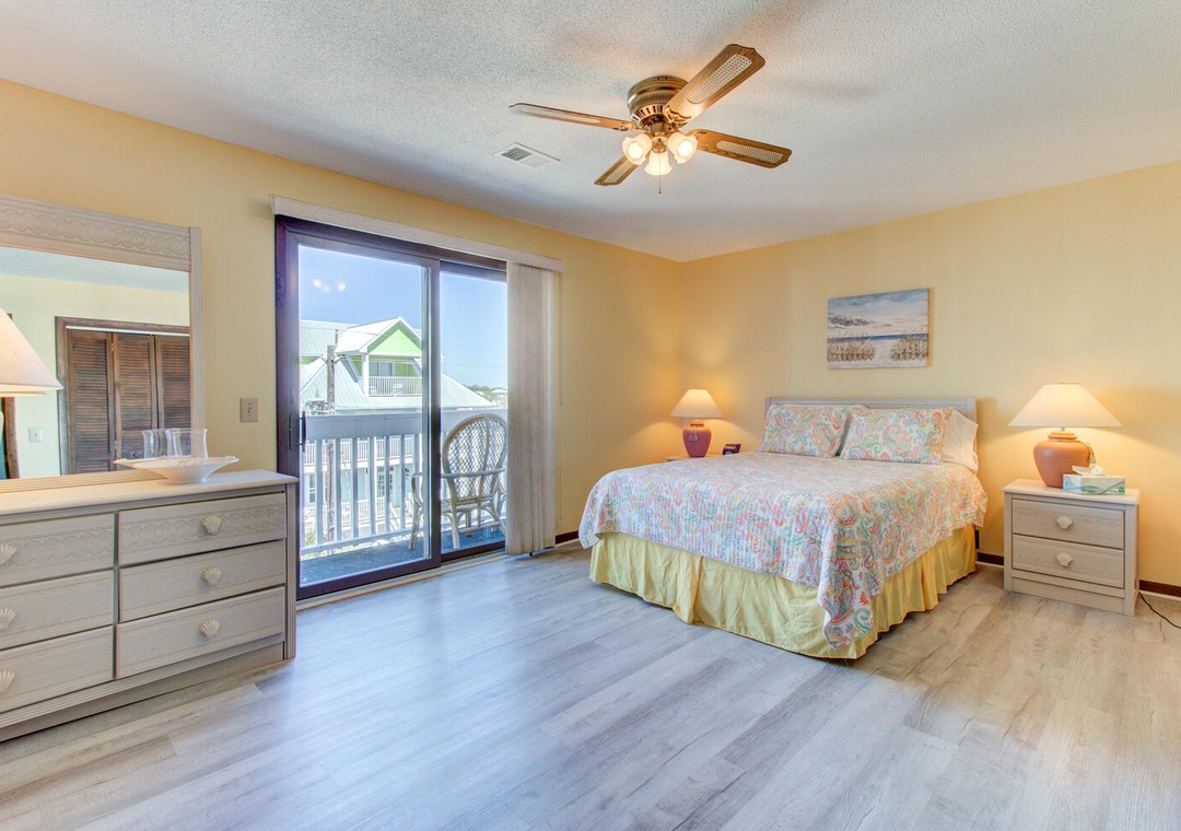 Master Bedroom: Queen bed with private street view deck