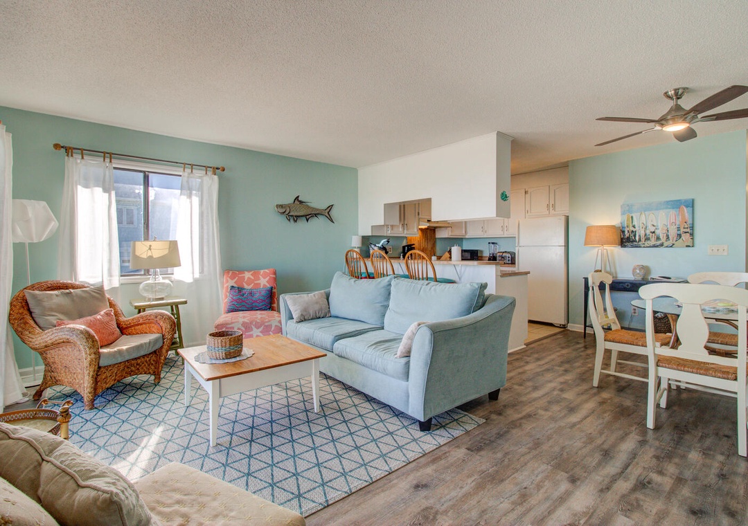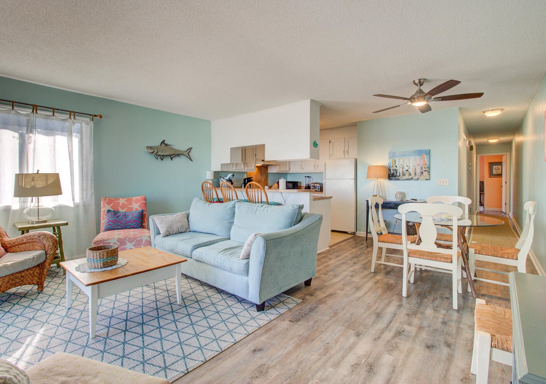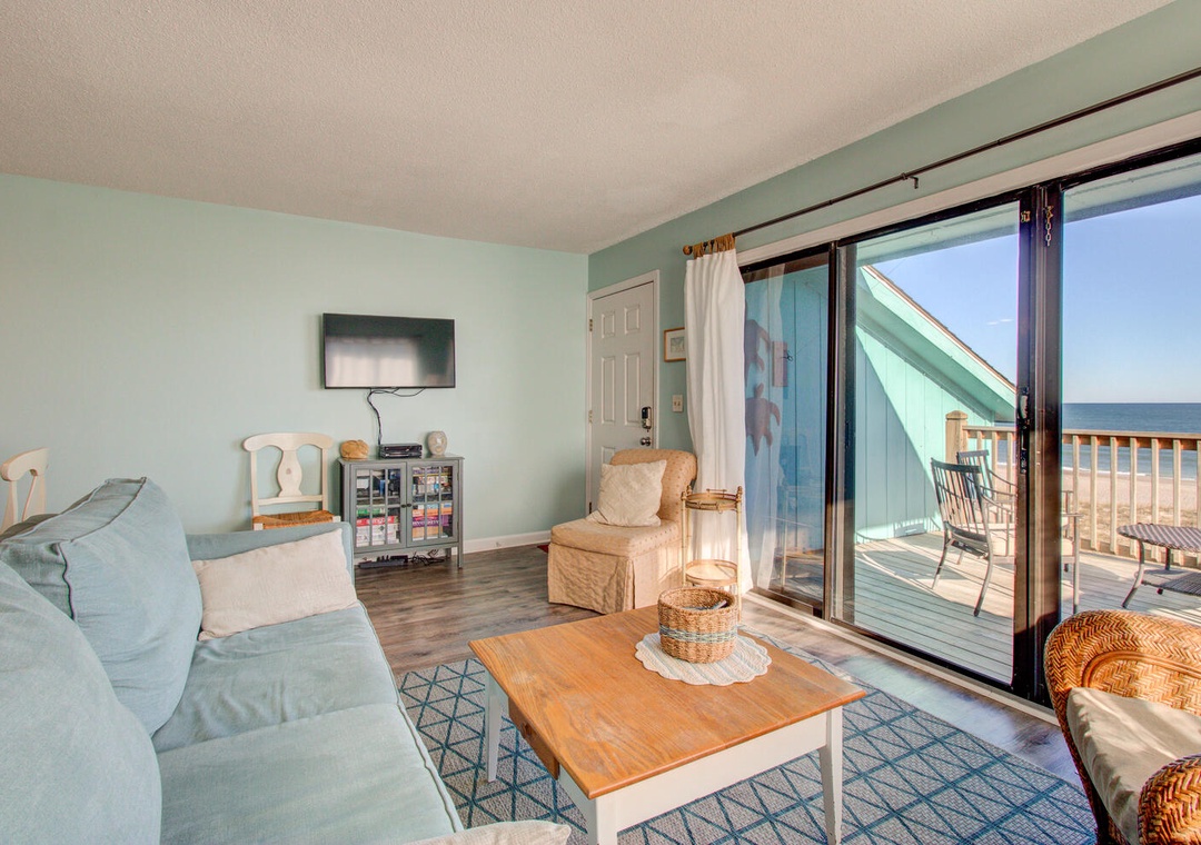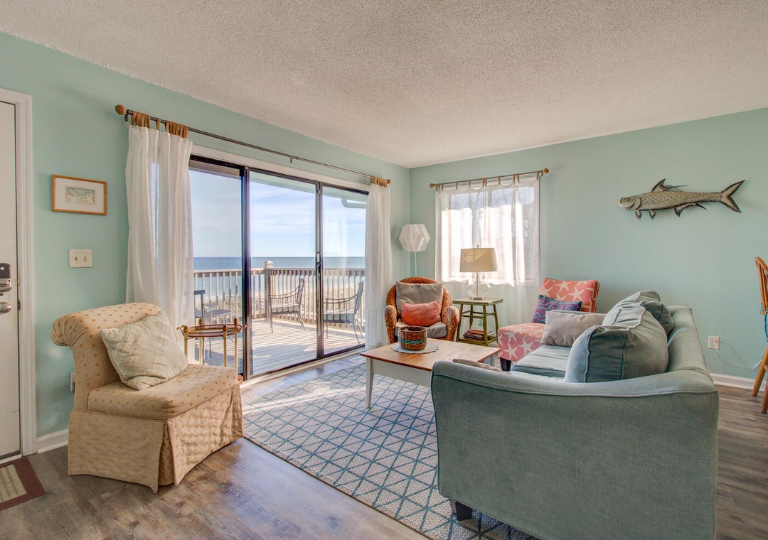 The condo comes fully equipped with all the amenities you need, from central air and complimentary Wi-Fi to cable TV, fresh linens, and laundry facilities. The bright and airy living room with deck access is perfect for relaxing after a day out, and the condo’s location makes exploring the best of Carolina Beach a breeze. With nearby favorites like Britt's Donuts and local eateries just a walk or short drive away, you’ll find the ideal balance of adventure and relaxation here at our inviting oceanfront getaway.