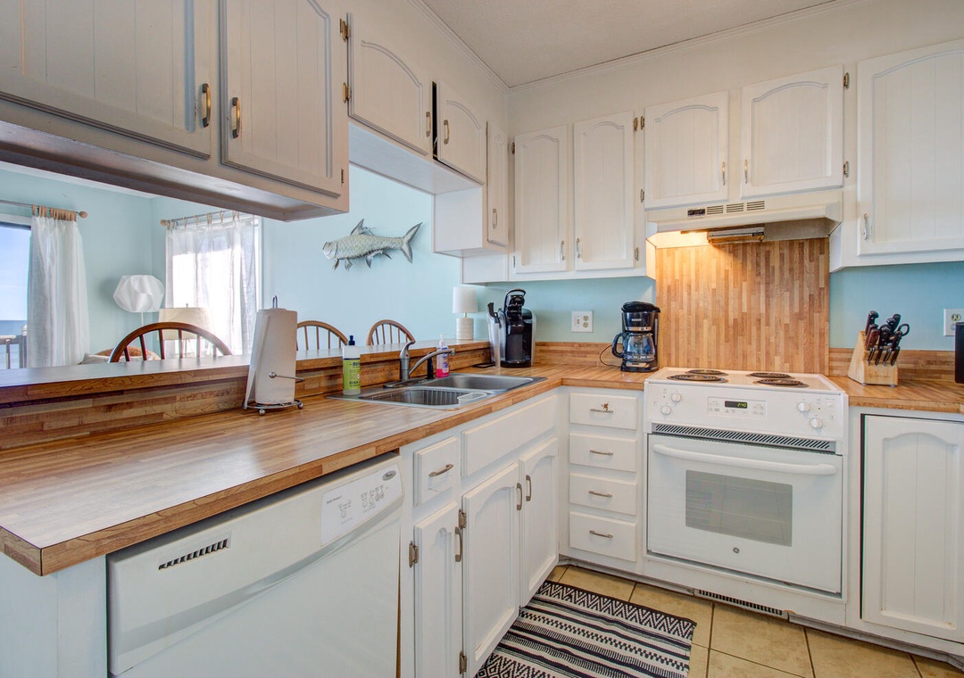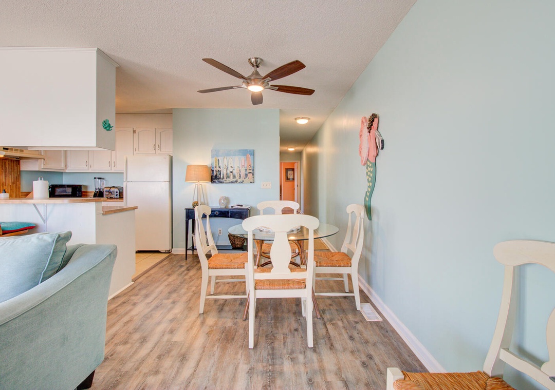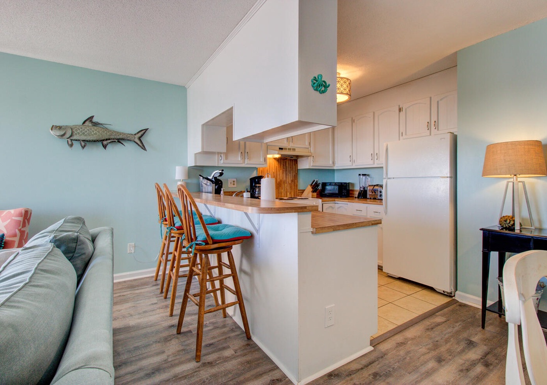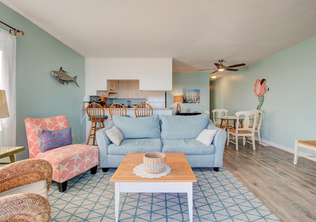 The condo comes fully equipped with all the amenities you need, from central air and complimentary Wi-Fi to cable TV, fresh linens, and laundry facilities. The bright and airy living room with deck access is perfect for relaxing after a day out, and the condo’s location makes exploring the best of Carolina Beach a breeze. With nearby favorites like Britt's Donuts and local eateries just a walk or short drive away, you’ll find the ideal balance of adventure and relaxation here at our inviting oceanfront getaway.