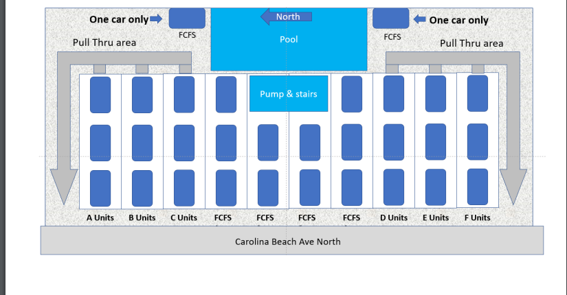 Parking is suitable for COMPACT to MID-SIZE vehicles only. Oversize vehicles may not fit and are the responsibility of the vehicle’s owner to find adequate parking if the vehicle does not fit in the unit’s provided parking space. Carolina Beach Realty is not responsible for finding additional parking for guests who bring more cars than allowed at the property.