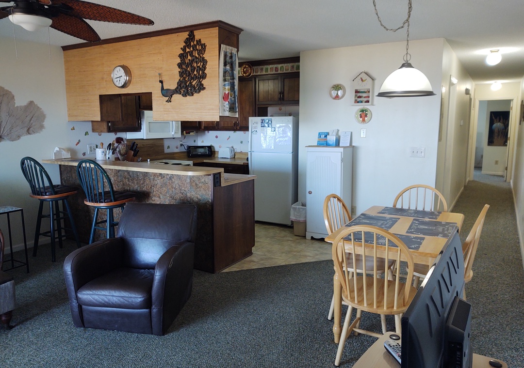 Inside, the open living area offers comfortable seating, a flat-screen TV with cable and DVD player, and access to the oceanfront deck with seating for four. The fully equipped kitchen features everything you need to prepare meals, including a refrigerator, dishwasher, and coffee maker, with dining space for four and additional bar seating for two. Both bedrooms are thoughtfully appointed, with the primary bedroom offering a queen bed, a flat-screen TV, and access to a private street-side balcony. The second bedroom features two twin beds, a pullout twin, and its own flat-screen TV, making it ideal for families or groups.