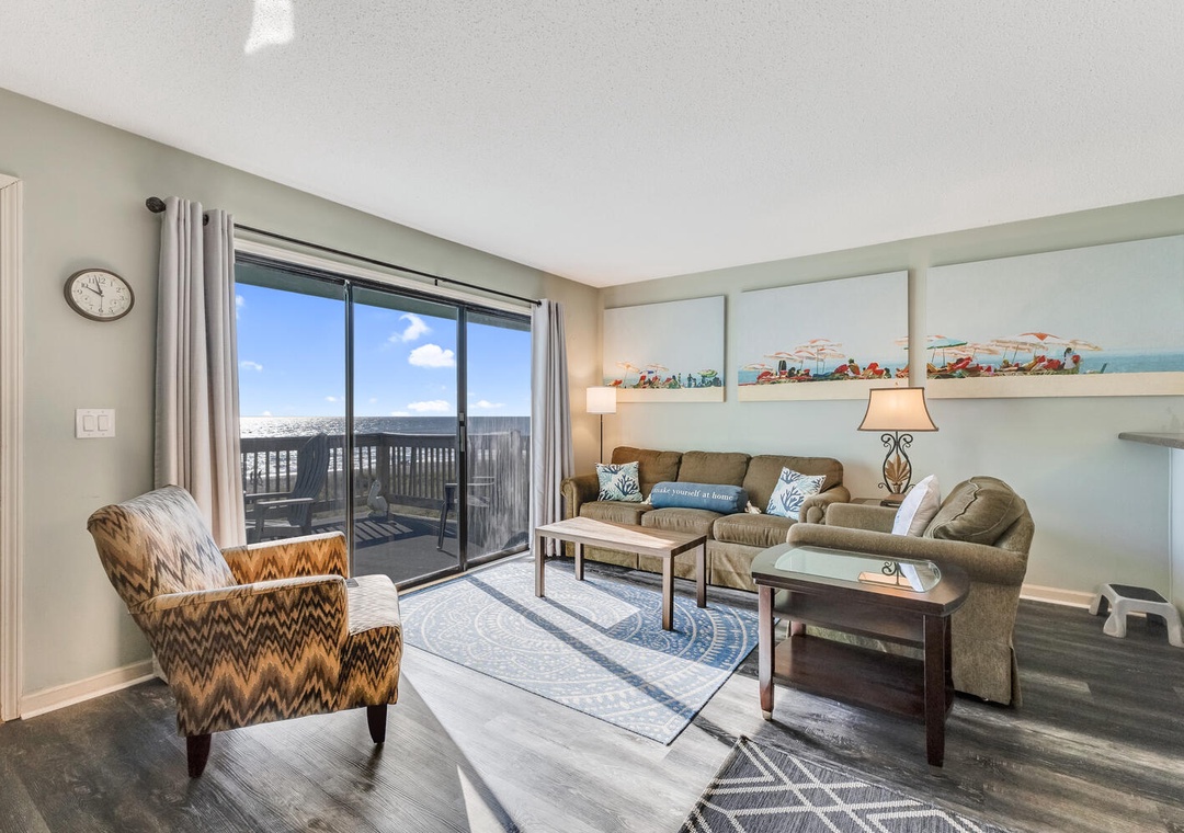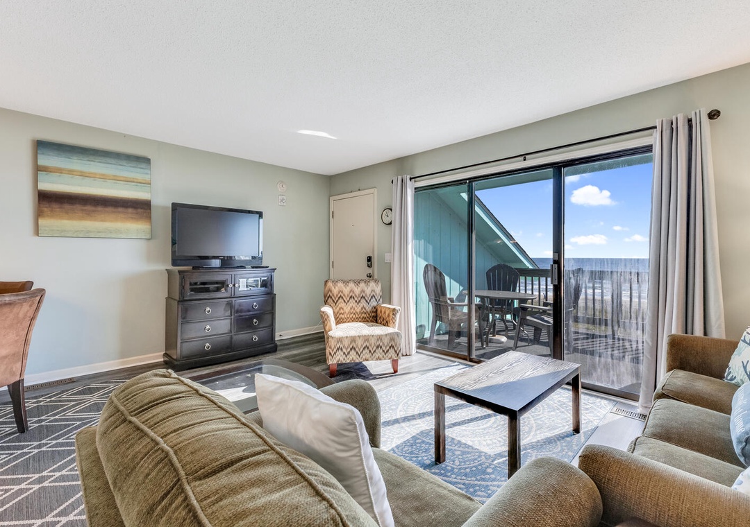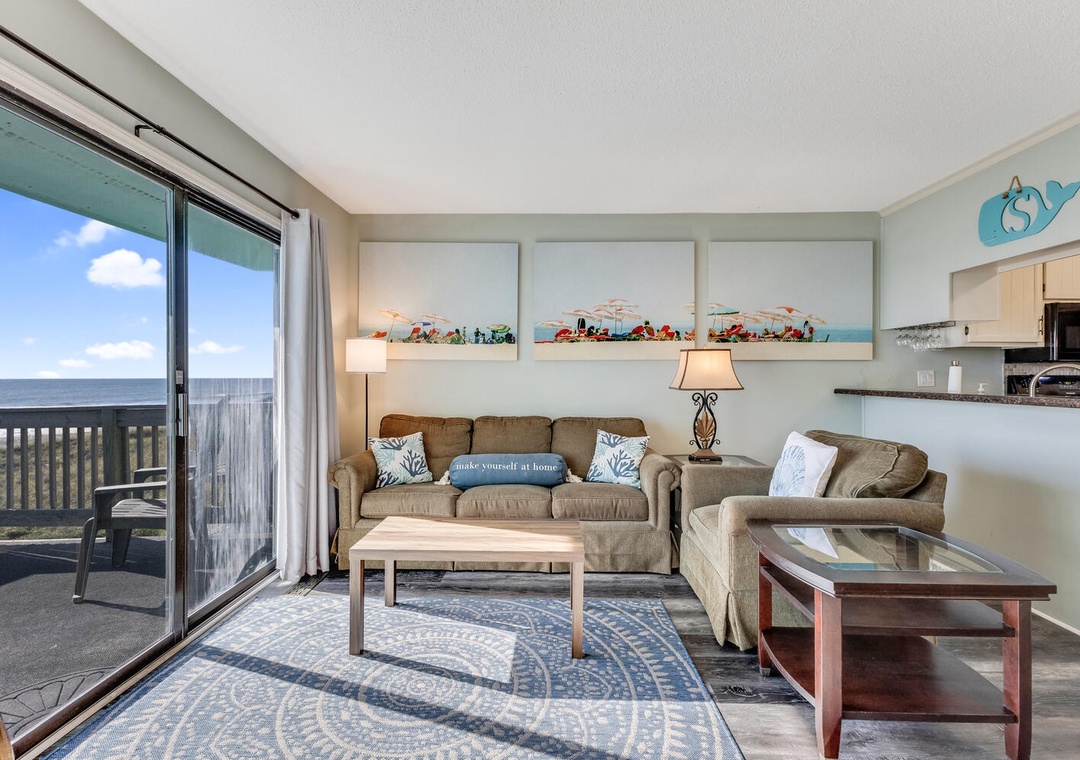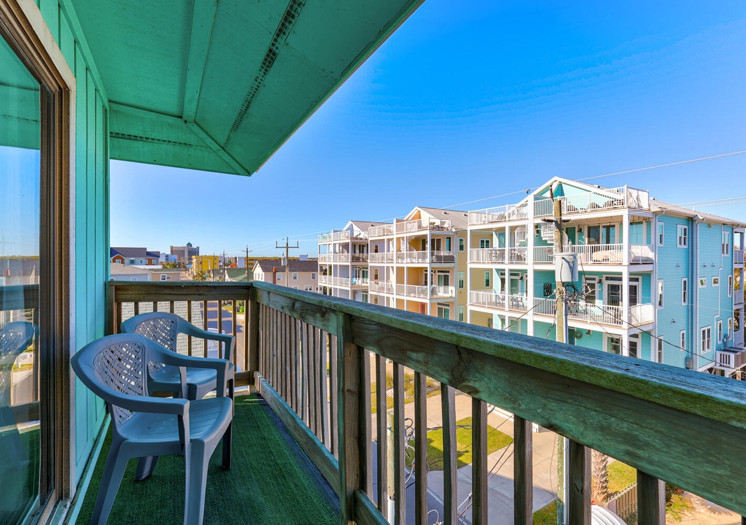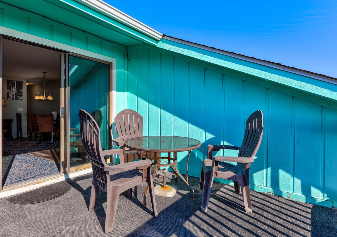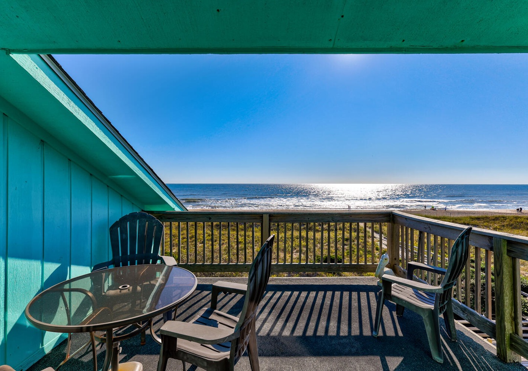 The condo features a spacious oceanfront deck with seating for 4—perfect for morning coffee or sunset cocktails—as well as a second balcony off the primary bedroom with street views.