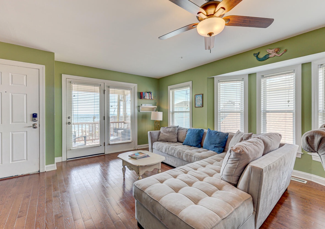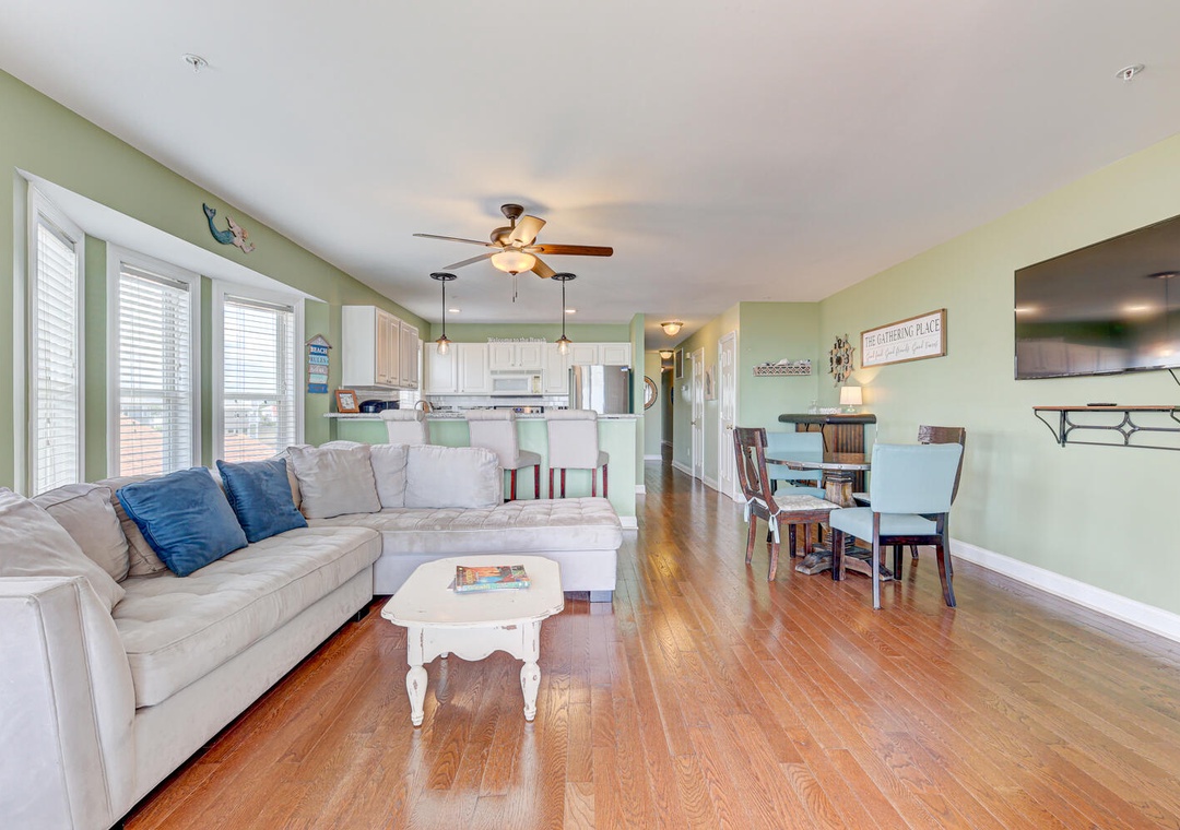Welcome to Writer’s Cove, a top-floor 3-bedroom, 2.5-bath condo offering breathtaking ocean views and an ideal location just a block from Freeman Park and the Carolina Beach Fishing Pier. With its open floor plan, this retreat is perfect for unwinding after a sun-soaked day at the beach. The spacious living room features a sectional sofa, Smart TV, and direct access to a private deck where you can soak in the coastal breeze.