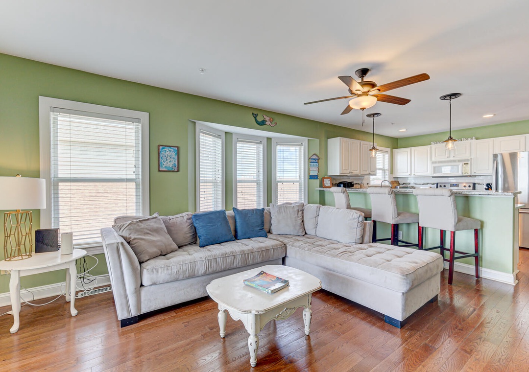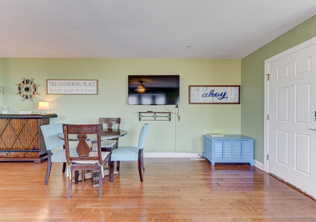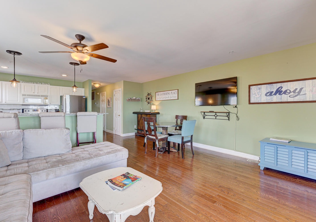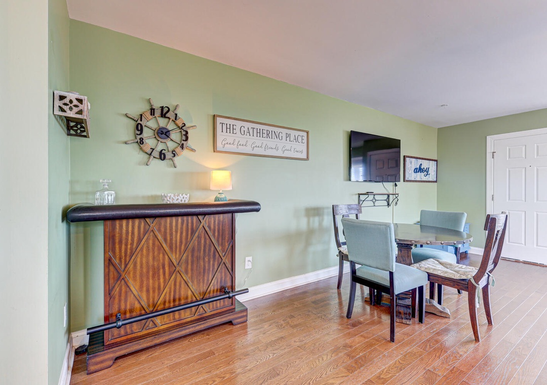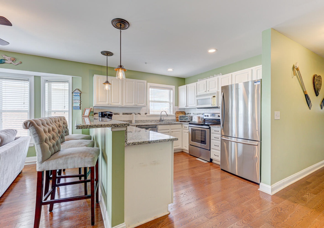 The fully equipped kitchen includes modern appliances, a flat-top stove, a Keurig and drip coffee maker, and ample seating with a dining table for four and bar seating for three. Whether you're cooking a family meal or enjoying takeout from a local seafood spot, this space has everything you need.
